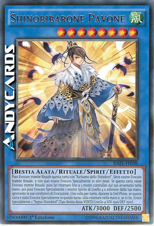 Puoi Evocare tramite Rituale questa carta con "Richiamo dello Shinobird". Deve essere Evocato tramite Rituale, e non può essere Evocato Specialmente in altri modi. Se questa carta viene Evocata tramite Rituale: puoi far ritornare fino a 3 mostri controllati dal tuo avversario nella mano, poi puoi Evocare Specialmente 1 mostro Spirito di Livello 4 o inferiore dalla tua mano, ignorando le sue condizioni di Evocazione. Una volta per turno, durante la End Phase, se questa carta è stata Evocata Specialmente in questo turno: falla ritornare nella mano e, se lo fai, Evoca Specialmente 2 "Segna-Shinobird" (Tipo Bestia Alata/VENTO/Livello 4/ATK 1500/DEF 1500).