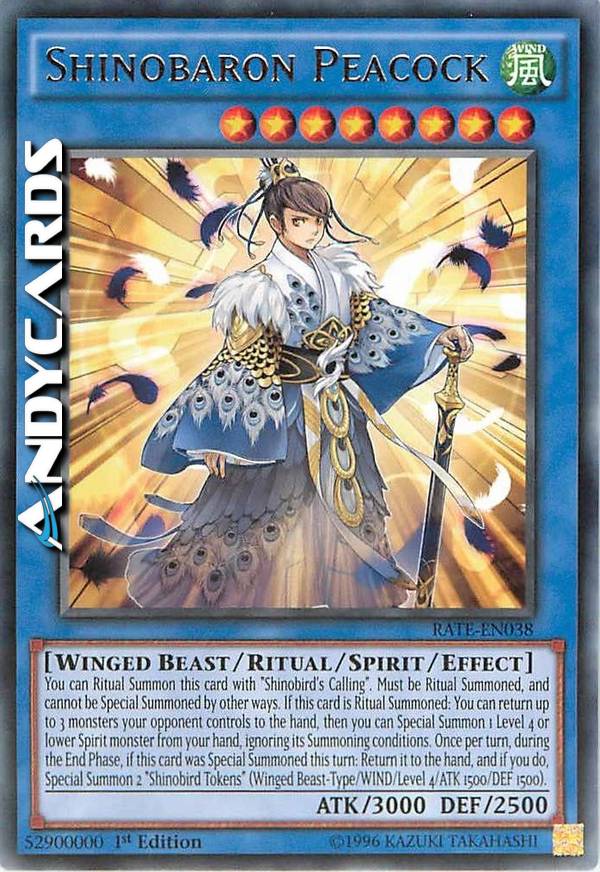 You can Ritual Summon this card with "Shinobird's Calling". Must be Ritual Summoned, and cannot be Special Summoned by other ways. If this card is Ritual Summoned: You can return up to 3 monsters your opponent controls to the hand, then you can Special Summon 1 Level 4 or lower Spirit monster from your hand, ignoring its Summoning conditions. Once per turn, during the End Phase, if this card was Special Summoned this turn: Return it to the hand, and if you do, Special Summon 2 "Shinobird Tokens" (Winged Beast-Type/WIND/Level 4/ATK 1500/DEF 1500).