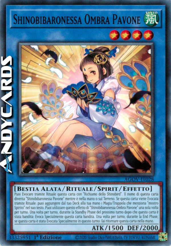 Puoi Evocare tramite Rituale questa carta con "Richiamo dello Shinobird". Il nome di questa carta diventa "Shinobibaronessa Pavone" mentre è nella mano o sul Terreno. Se questa carta viene Evocata tramite Rituale: puoi aggiungere dal tuo Deck alla tua mano 1 Magia/Trappola che menziona "mostro Spirito" nel suo testo. Puoi utilizzare questo effetto di "Shinobibaronessa Ombra Pavone" una sola volta per turno. Una volta per turno, durante la Standby Phase del prossimo turno dopo che questa carta è stata bandita: Evoca Specialmente questa carta bandita. Una volta per turno, durante la End Phase, se questa carta è stata Evocata Specialmente in questo turno: fai ritornare questa carta nella mano.