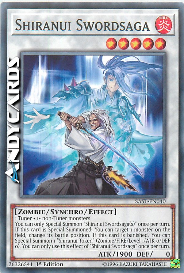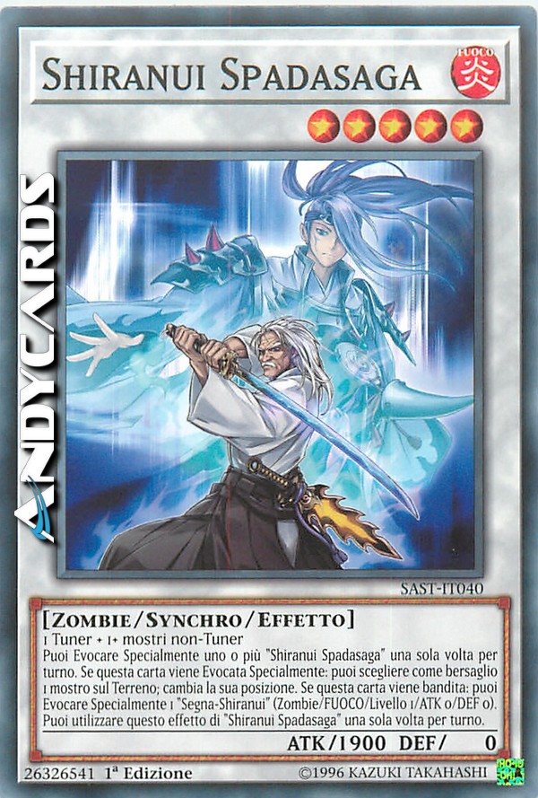 Puoi Evocare Specialmente uno o più "Shiranui Spadasaga" una sola volta per turno. Se questa carta viene Evocata Specialmente: puoi scegliere come bersaglio 1 mostro sul Terreno; cambia la sua posizione. Se questa carta viene bandita: puoi Evocare Specialmente 1 "Segna-Shiranui" (Zombie/FUOCO/Livello 1/ATK 0/DEF 0). Puoi utilizzare questo effetto di "Shiranui Spadasaga" una sola volta per turno.