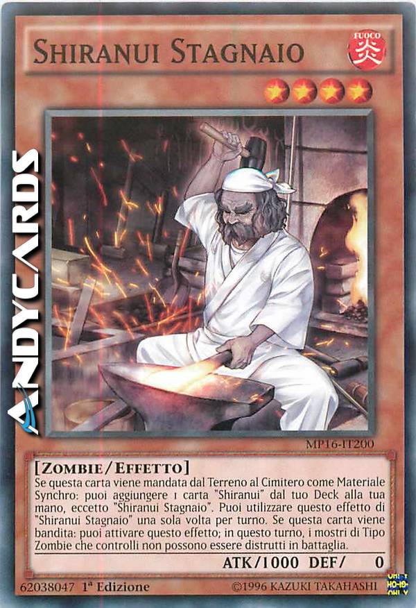 Se questa carta viene mandata dal Terreno al Cimitero come Materiale Synchro: puoi aggiungere 1 carta "Shiranui" dal tuo Deck alla tua mano, eccetto "Shiranui Stagnaio". Puoi utilizzare questo effetto di "Shiranui Stagnaio" una sola volta per turno. Se questa carta viene bandita: puoi attivare questo effetto; in questo turno, i mostri di Tipo Zombie che controlli non possono essere distrutti in battaglia.