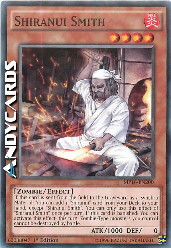 If this card is sent from the field to the Graveyard as a Synchro Material: You can add1 "Shiranui" card from your Deck to your hand, except "Shiranui Smith". You can only use this effect of "Shiranui Smith" once per turn. If this card is banished: You can activate this effect; this turn, Zombie-Type monsters you control cannot be destroyed by battle.