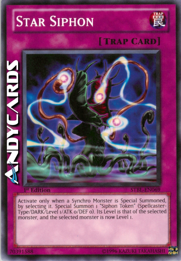 Activate only when a Synchro Monster is Special Summoned, by selecting it. Special Summon 1 "Siphon Token" (Spellcaster-Type/DARK/Level 1/ATK 0/DEF 0). Its Level is that of the selected monster, and the selected monster is now Level 1.