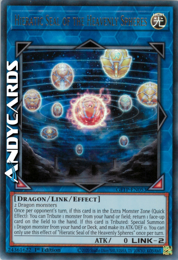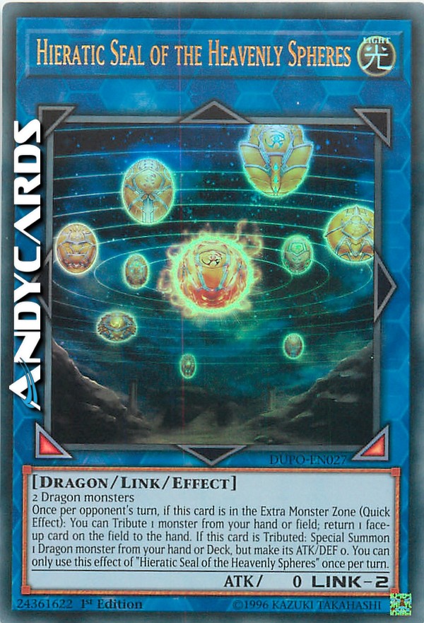 Once per opponent's turn, if this card is in the Extra Monster Zone (Quick Effect): You can Tribute 1 monster from your hand or field; return 1 face-up card on the field to the hand. If this card is Tributed: Special Summon 1 Dragon monster from your hand or Deck, and make its ATK/DEF 0. You can only use this effect of "Hieratic Seal of the Heavenly Spheres" once per turn.