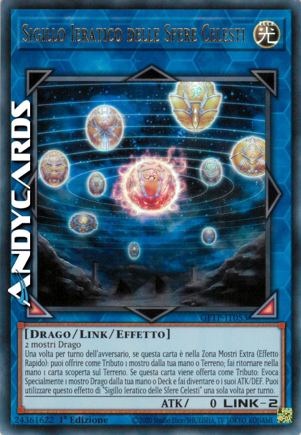 Una volta per turno dell'avversario, se questa carta è nella Zona Mostri Extra (Effetto Rapido): puoi offrire come Tributo 1 mostro dalla tua mano o Terreno; fai ritornare nella mano 1 carta scoperta sul Terreno. Se questa carta viene offerta come Tributo: Evoca Specialmente 1 mostro Drago dalla tua mano o Deck e fai diventare 0 i suoi ATK/DEF. Puoi utilizzare questo effetto di "Sigillo Ieratico delle Sfere Celesti" una sola volta per turno.