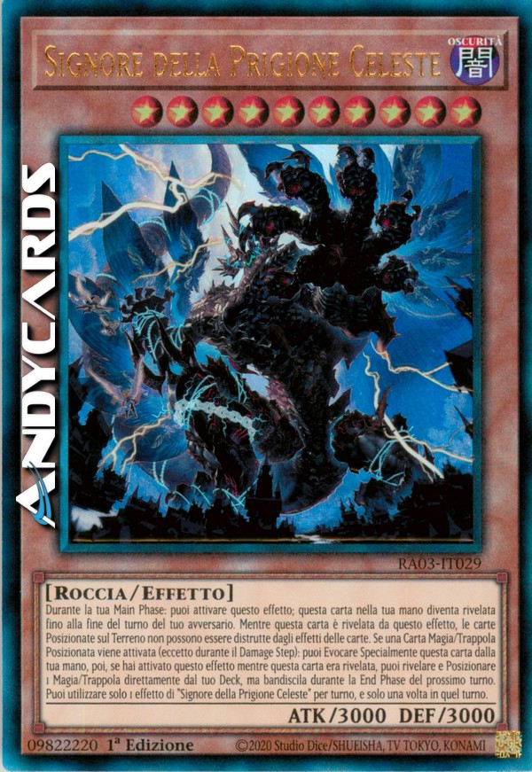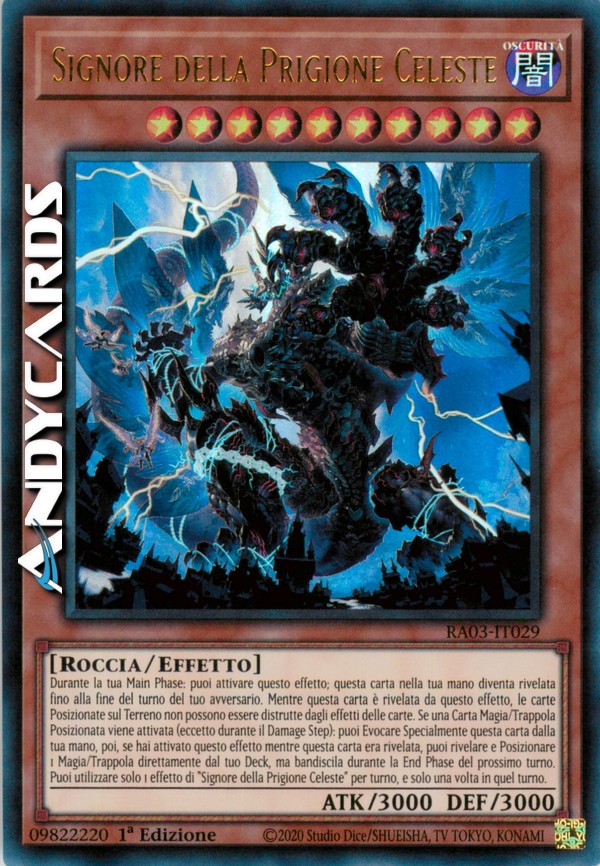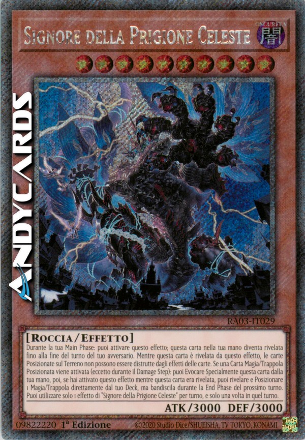 Durante la tua Main Phase: puoi attivare questo effetto; questa carta nella tua mano diventa rivelata fino alla fine del turno del tuo avversario. Mentre questa carta è rivelata da questo effetto, le carte Posizionate sul Terreno non possono essere distrutte dagli effetti delle carte. Se una Carta Magia/Trappola Posizionata viene attivata (eccetto durante il Damage Step): puoi Evocare Specialmente questa carta dalla tua mano, poi, se hai attivato questo effetto mentre questa carta era rivelata, puoi rivelare e Posizionare 1 Magia/Trappola dal tuo Deck, ma bandiscila durante la End Phase del prossimo turno. Puoi utilizzare solo 1 effetto di "Signore della Prigione Celeste" per turno, e solo una volta in quel turno.