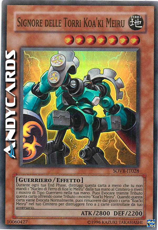 Durante ogni tua End Phase, distruggi questa carta a meno che tu non mandi 1 "Nucleo di Ferro di Koa'ki Meiru" dalla tua mano al Cimitero o riveli 1 mostro di Tipo Guerriero nella tua mano. Puoi Evocare tramite Tributo questa carta offrendo come Tributo 1 mostro "Koa'ki Meiru". Quando questa carta viene Evocata Normalmente, puoi rimuovere dal gioco 1 carta "Koa'ki Meiru" nel tuo Cimitero per distruggere fino a 2 carte controllate dal tuo avversario.