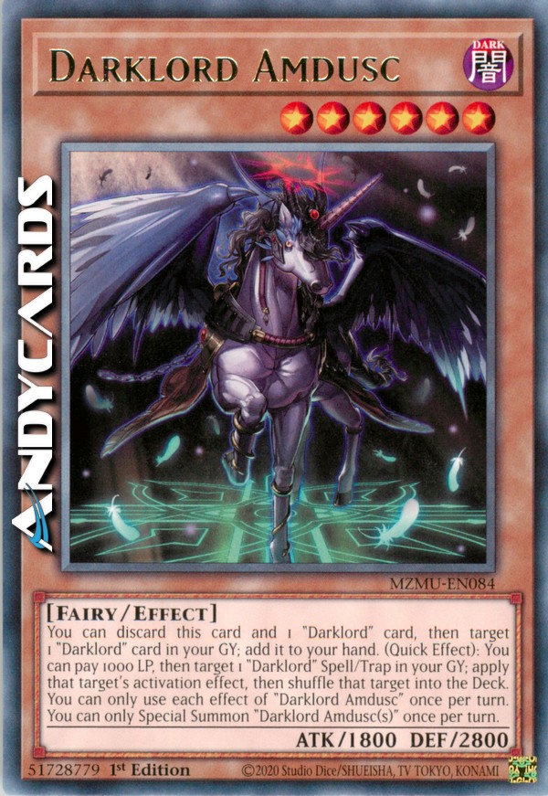 You can discard this card and 1 "Darklord" card, then target 1 "Darklord" card in your GY; add it to your hand. (Quick Effect): You can pay 1000 LP, then target 1 "Darklord" Spell/Trap in your GY; apply that target's activation effect, then shuffle that target into the Deck. You can only use each effect of "Darklord Amdusc" once per turn. You can only Special Summon "Darklord Amdusc(s)" once per turn.