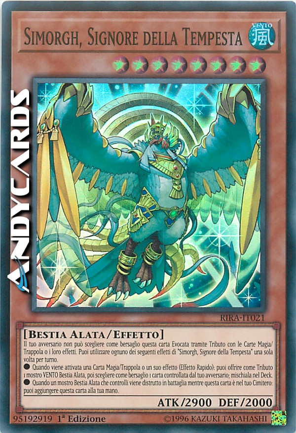 Il tuo avversario non può scegliere come bersaglio questa carta Evocata tramite Tributo con le Carte Magia/Trappola o i loro effetti. Puoi utilizzare ognuno dei seguenti effetti di "Simorgh, Signore della Tempesta" una sola volta per turno.