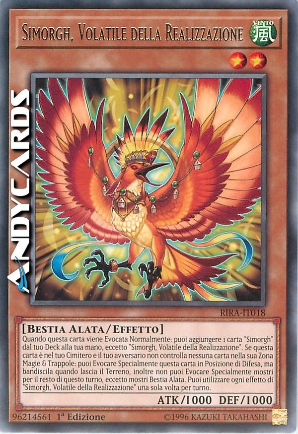 Quando questa carta viene Evocata Normalmente: puoi aggiungere 1 carta "Simorgh" dal tuo Deck alla tua mano, eccetto "Simorgh, Volatile della Realizzazione". Se questa carta è nel tuo Cimitero e il tuo avversario non controlla nessuna carta nella sua Zona Magie & Trappole: puoi Evocare Specialmente questa carta in Posizione di Difesa, ma bandiscila quando lascia il Terreno, inoltre non puoi Evocare Specialmente mostri per il resto di questo turno, eccetto mostri Bestia Alata. Puoi utilizzare ogni effetto di "Simorgh, Volatile della Realizzazione" una sola volta per turno.