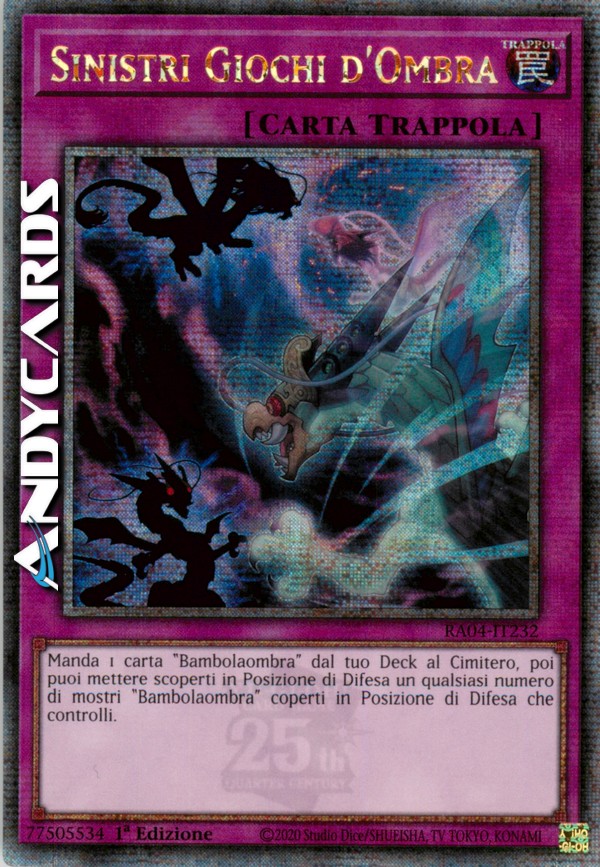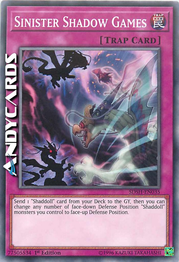 Manda 1 carta "Bambolaombra" dal tuo Deck al Cimitero, poi puoi mettere scoperti in Posizione di Difesa un qualsiasi numero di mostri "Bambolaombra" coperti in Posizione di Difesa che controlli.
