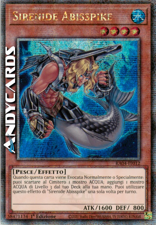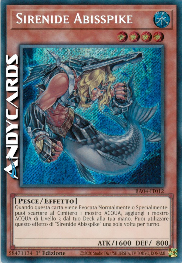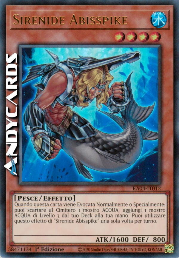 Quando questa carta viene Evocata Normalmente o Specialmente: puoi scartare al Cimitero 1 mostro ACQUA; aggiungi 1 mostro ACQUA di Livello 3 dal tuo Deck alla tua mano. Puoi utilizzare questo effetto di "Sirenide Abisspike" una sola volta per turno.