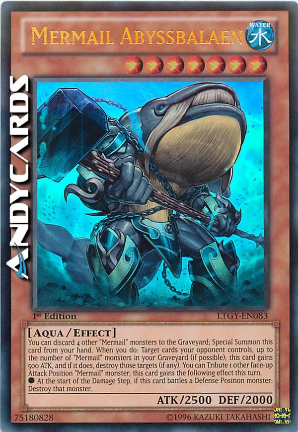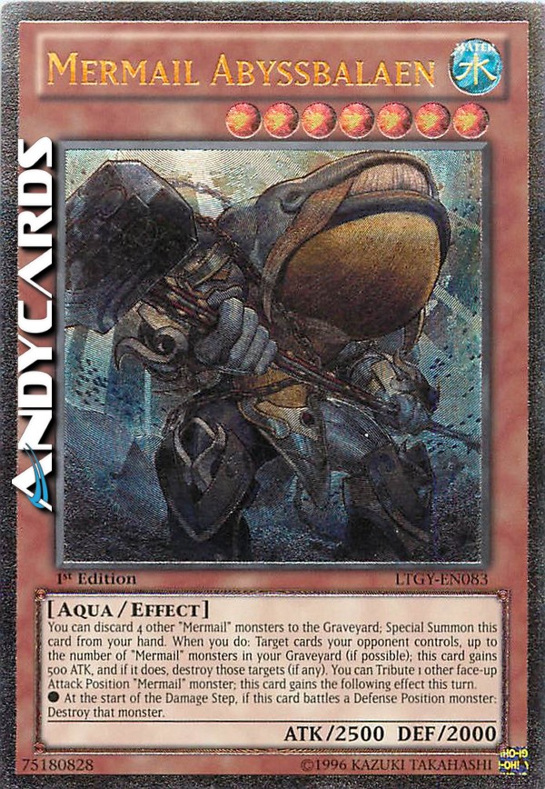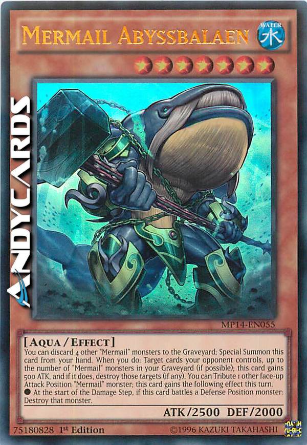 You can discard 4 other "Mermail" monsters to the Graveyard; Special Summon this card from your hand. When you do: Target cards your opponent controls, up to the number of "Mermail" monsters in your Graveyard (if possible); this card gains 500 ATK, and if it does, destroy those targets (if any). You can Tribute 1 other face-up Attack Position "Mermail" monster; this card gains the following effect this turn.