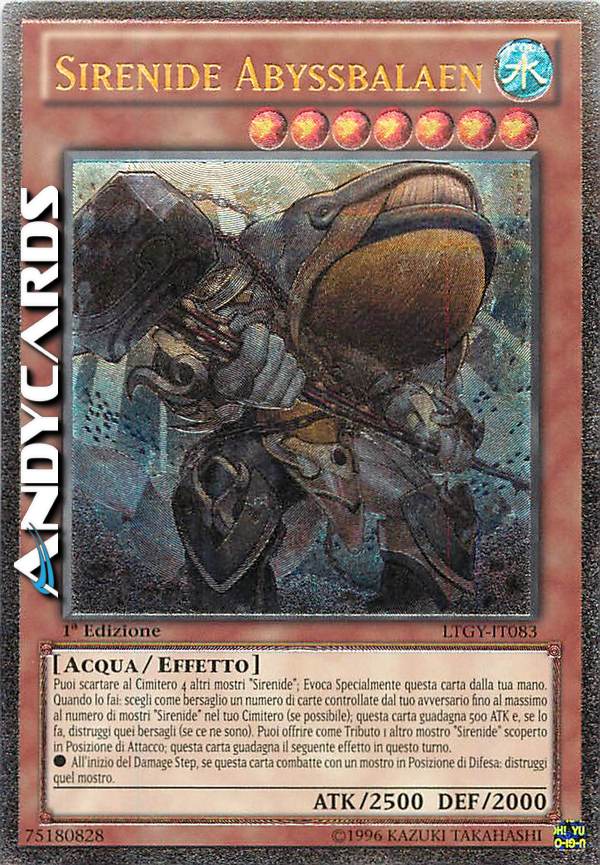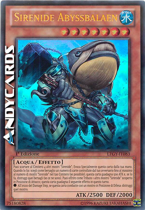 Puoi scartare al Cimitero 4 altri mostri "Sirenide"; Evoca Specialmente questa carta dalla tua mano. Quando lo fai: scegli come bersaglio di carte controllate dal tuo avversario fino al massimo al numero di mostro "Sirenide" nel tuo Cimitero (se possibile); questa carta guadagna 500 ATK e, se lo fa, distruggi quei bersagli (se ce ne sono). Puoi offrire come Tributo 1 altro mostro "Sirenide" scoperto in Posizione di Attacco; questa carta guadagna il seguente effetto in questo turno.