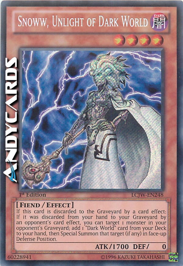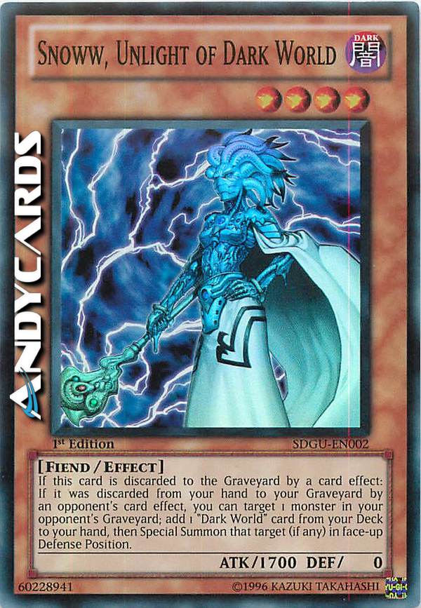 Se questa carta viene scartata al Cimitero dall'effetto di una carta: se è stata scartata dalla tua mano al tuo Cimitero dall'effetto di una carta dell'avversario, puoi scegliere come bersaglio 1 mostro nel Cimitero del tuo avversario; aggiungi 1 carta "Mondo Oscuro" dal tuo Deck alla tua mano, poi Evoca Specialmente quel bersaglio (se l'hai scelto) scoperto in Posizione di Difesa.