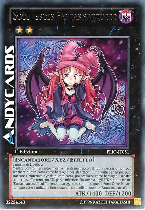 Mentre controlli un altro mostro "Fantasmatrucco", il tuo avversario non può scegliere questa carta come bersaglio per gli attacchi. Una volta per turno: puoi staccare 1 Materiale Xyz da questa carta, poi scegliere come bersaglio 1 mostro scoperto sul Terreno con ATK pari o inferiore alla somma degli ATK di tutti i mostri "Fantasmatrucco" sul Terreno; distruggilo e, se lo fai, quella Zona Carte Mostro non può essere utilizzata fino a quando controlli un mostro "Fantasmatrucco".