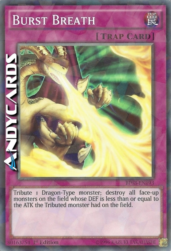 Offri 1 mostro di Tipo Drago sul tuo Terreno come Tributo per distruggere tutti i mostri scoperti sul Terreno con DEF uguale o inferiore all' ATK del mostro offerto come Tributo.