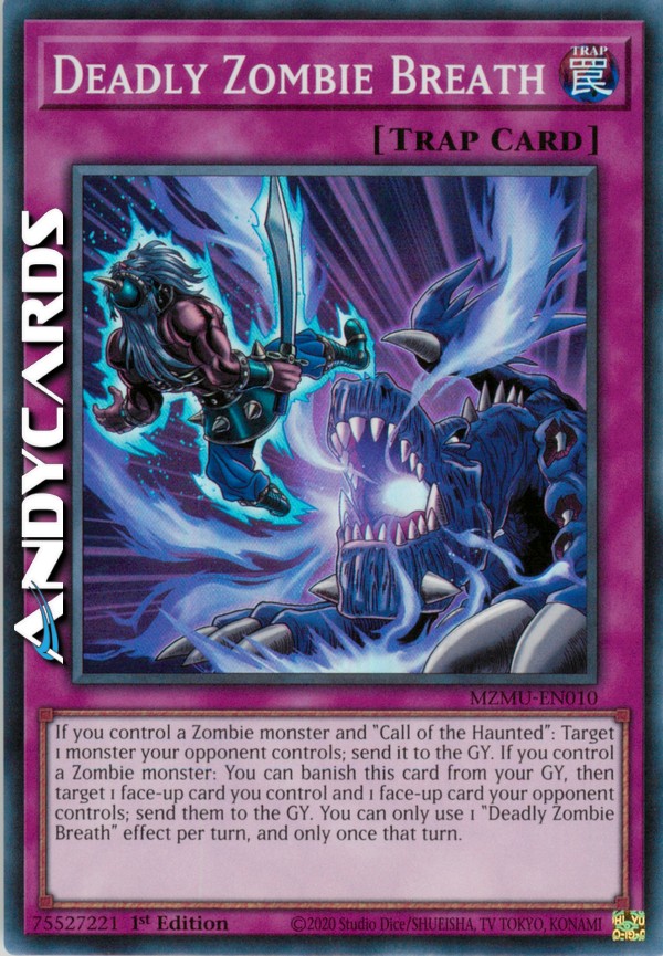 If you control a Zombie monster and "Call of the Haunted": Target 1 monster your opponent controls; send it to the GY. If you control a Zombie monster: You can banish this card from your GY, then target 1 face-up card you control and 1 face-up card your opponent controls; send them to the GY. You can only use 1 "Deadly Zombie Breath" effect per turn, and only once that turn.