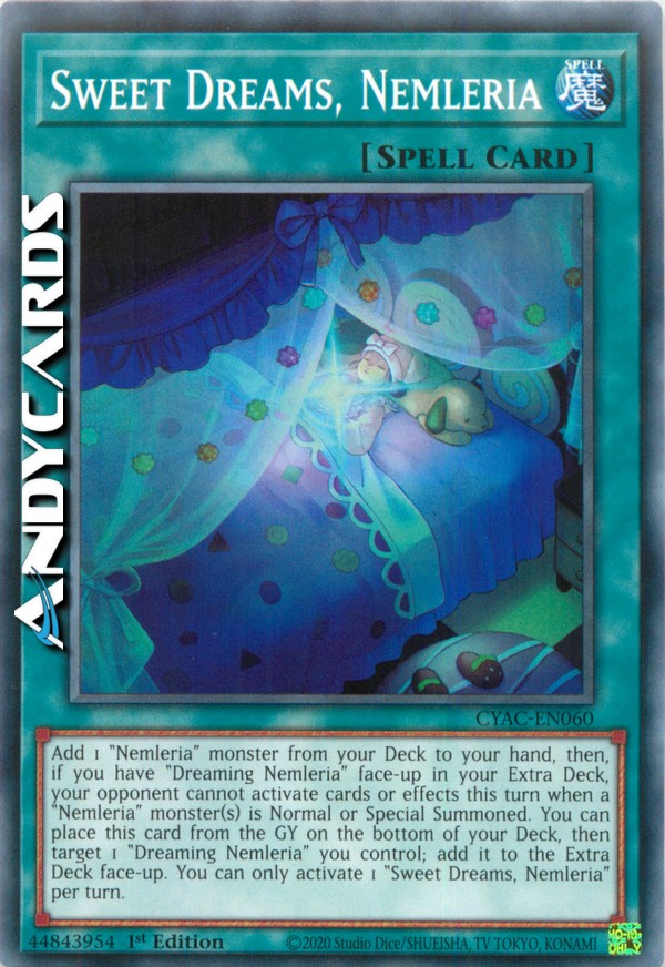 Aggiungi 1 mostro "Nemleria" dal tuo Deck alla tua mano, poi, se hai "Nemleria Sognante" scoperta nel tuo Extra Deck, il tuo avversario non può attivare carte o effetti in questo turno quando uno o più mostri "Nemleria" vengono Evocati Normalmente o Specialmente. Puoi mettere questa carta dal Cimitero in fondo al tuo Deck, poi scegliere come bersaglio 1 "Nemleria Sognante" che controlli; aggiungila all'Extra Deck scoperto. Puoi attivare solo 1 "Sogni d'Oro, Nemleria" per turno.