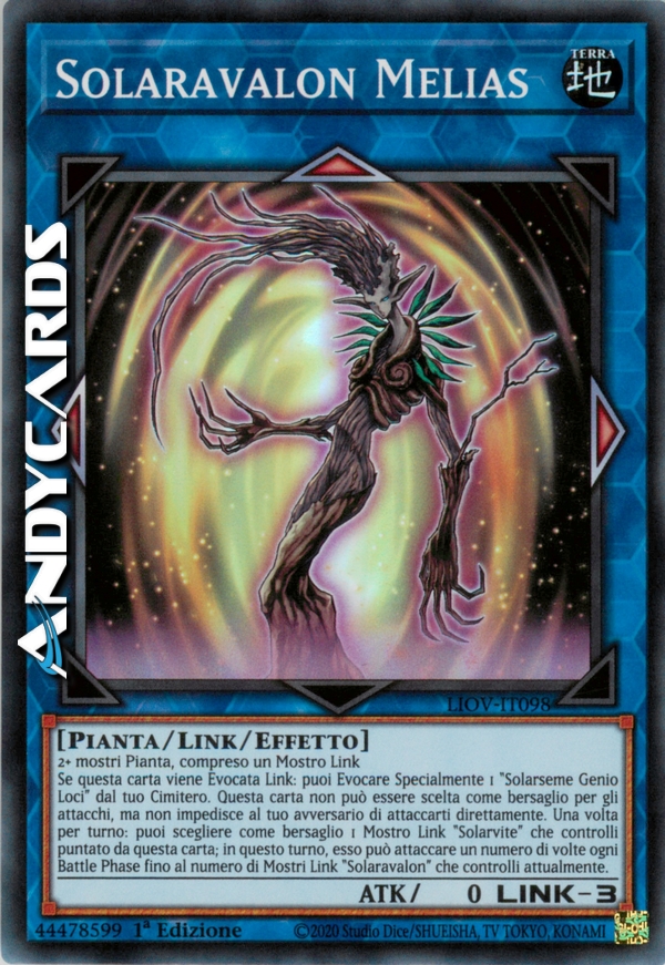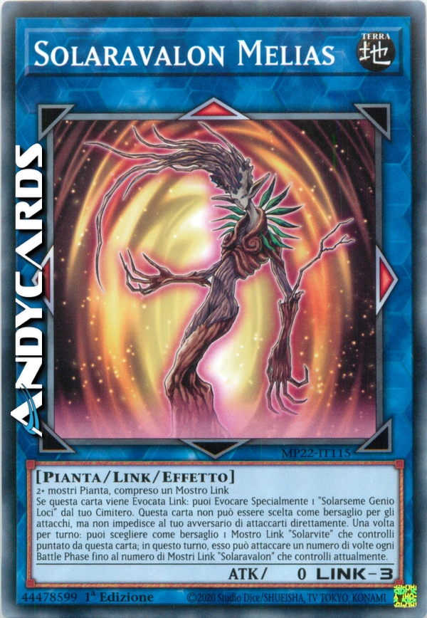 Se questa carta viene Evocata Link: puoi Evocare Specialmente 1 "Solarseme Genio Loci" dal tuo Cimitero. Questa carta non può essere scelta come bersaglio per gli attacchi, ma non impedisce al tuo avversario di attaccarti direttamente. Una volta per turno: puoi scegliere come bersaglio 1 Mostro Link "Solarvite" che controlli puntato da questa carta; in questo turno, esso può attaccare un numero di volte ogni Battle Phase fino al numero di Mostri Link "Solaravalon" che controlli attualmente.
