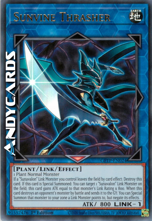 If a "Sunavalon" Link Monster you control leaves the field by card effect: Destroy this card. If this card is Special Summoned: You can target 1 "Sunavalon" Link Monster on the field; this card gains ATK equal to that monster's Link Rating x 800. When this card destroys an opponent's monster by battle and sends it to the GY: You can Special Summon that monster to your zone a Link Monster points to, but negate its effects.