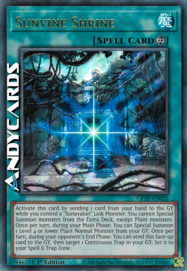 Activate this card by sending 1 card from your hand to the GY while you control a "Sunavalon" Link Monster. You cannot Special Summon monsters from the Extra Deck, except Plant monsters. Once per turn, during your Main Phase: You can Special Summon 1 Level 4 or lower Plant Normal Monster from your GY. Once per turn, during your opponent's End Phase: You can send this face-up card to the GY, then target 1 Continuous Trap in your GY; Set it to your Spell & Trap Zone.