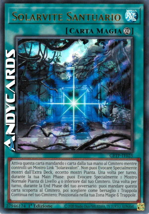 Attiva questa carta mandando 1 carta dalla tua mano al Cimitero mentre controlli un Mostro Link "Solaravalon". Non puoi Evocare Specialmente mostri dall'Extra Deck, eccetto mostri Pianta. Una volta per turno, durante la tua Main Phase: puoi Evocare Specialmente 1 Mostro Normale Pianta di Livello 4 o inferiore dal tuo Cimitero. Una volta per turno, durante la End Phase del tuo avversario: puoi mandare questa carta scoperta al Cimitero, poi scegliere come bersaglio 1 Trappola Continua nel tuo Cimitero; Posizionala nella tua Zona Magie & Trappole.