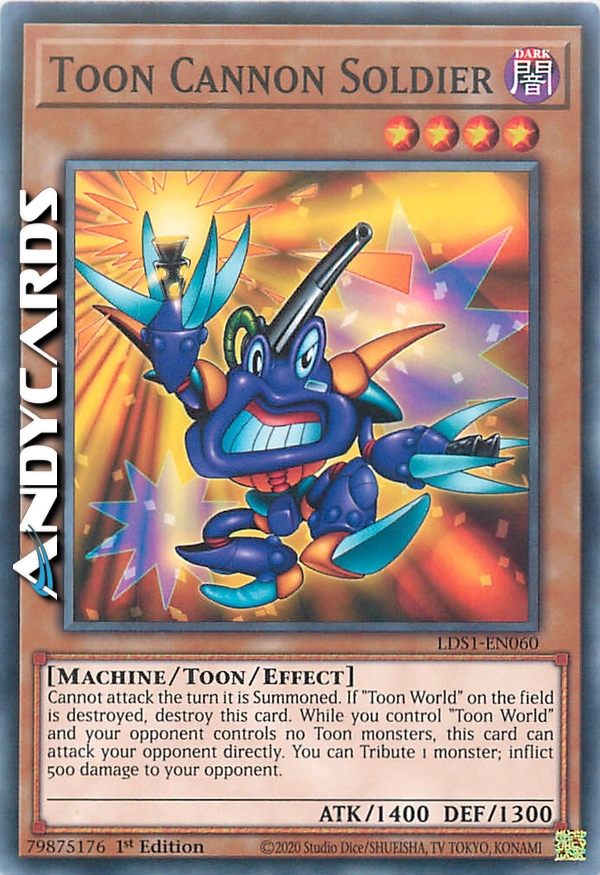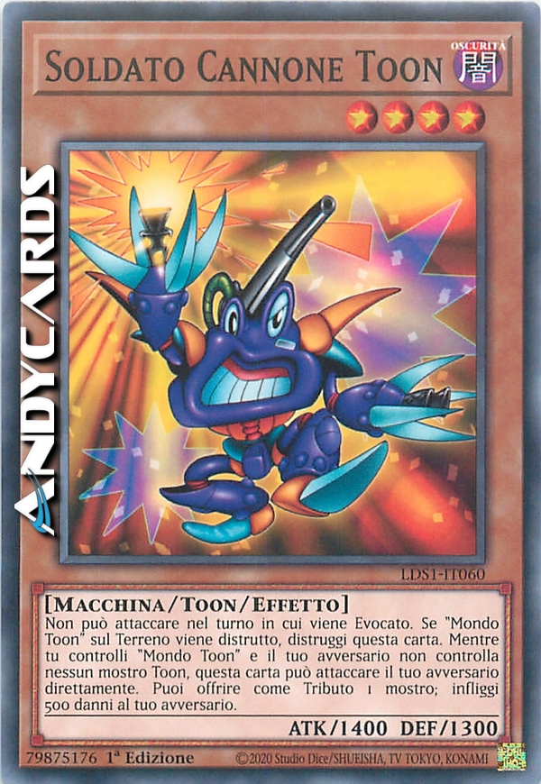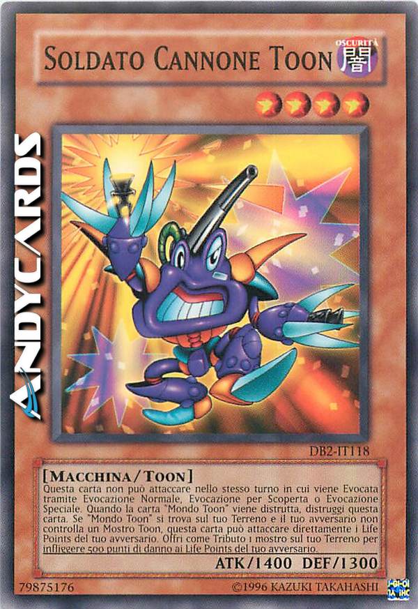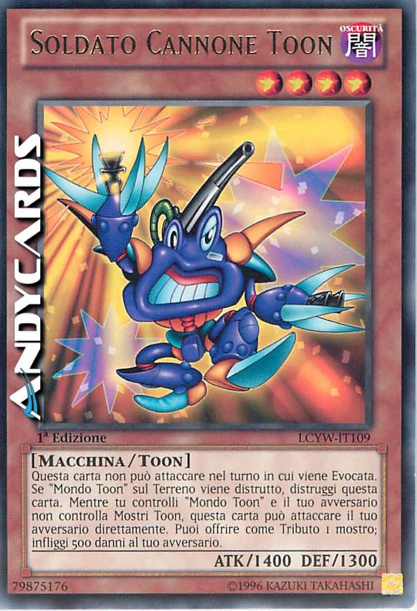 Questa carta non può attaccare nello stesso turno in cui viene Evocata tramite Evocazione Normale, Evocazione per Scoperta o Evocazione Speciale. Quando la carta "Mondo Toon" viene distrutta, distruggi questa carta. Se "Mondo Toon" si trova sul tuo Terreno e il tuo avversario non controlla un Mostro Toon, questa carta può attaccare direttamente i Life Points del tuo avversario. Offri come Tributo 1 mostro sul tuo Terreno per infliggere 500 punti di danno ai Life Points del tuo avversario.