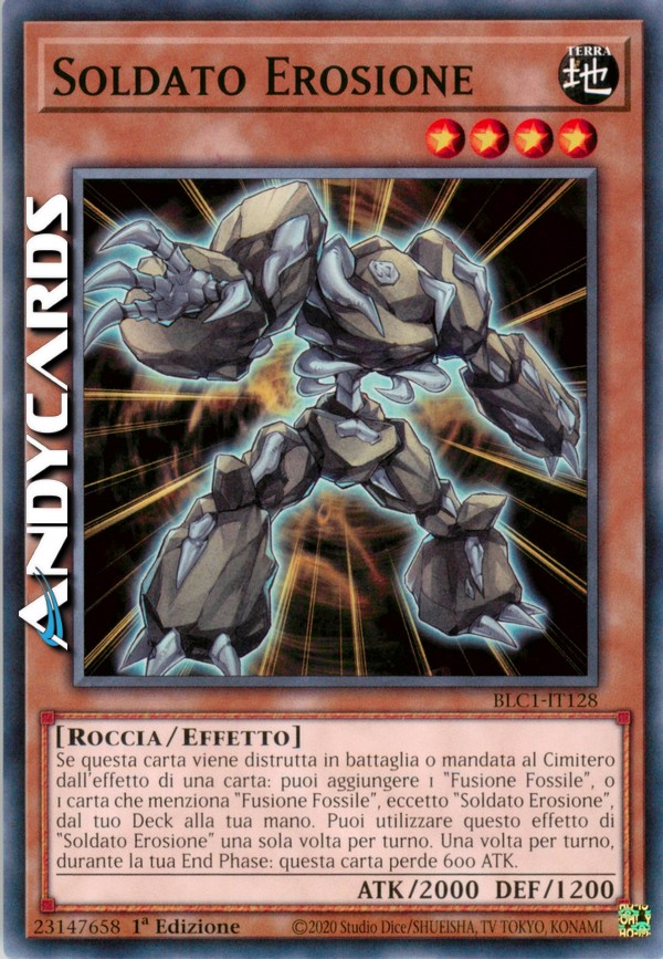 Se questa carta viene distrutta in battaglia o mandata al Cimitero dall'effetto di una carta: puoi aggiungere 1 "Fusione Fossile", o 1 carta che indica specificamente "Fusione Fossile" nel suo testo, eccetto "Soldato Erosione", dal tuo Deck alla tua mano. Puoi utilizzare questo effetto di "Soldato Erosione" una sola volta per turno. Una volta per turno, durante la tua End Phase: questa carta perde 600 ATK.