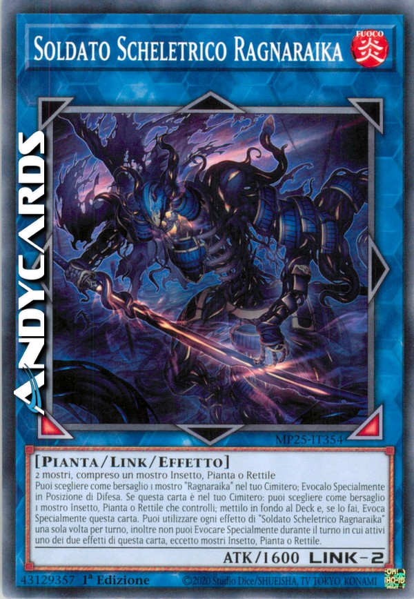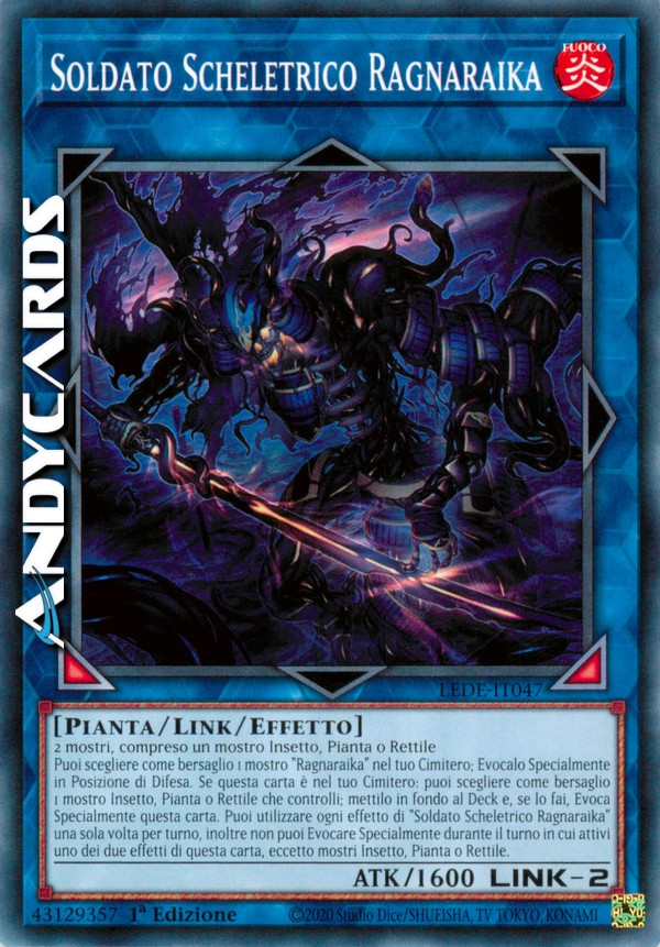 Puoi scegliere come bersaglio 1 mostro "Ragnaraika" nel tuo Cimitero; Evocalo Specialmente in Posizione di Difesa. Se questa carta è nel tuo Cimitero: puoi scegliere come bersaglio 1 mostro Insetto, Pianta o Rettile che controlli; mettilo in fondo al Deck e, se lo fai, Evoca Specialmente questa carta. Puoi utilizzare ogni effetto di "Soldato Scheletrico Ragnaraika" una sola volta per turno, inoltre non puoi Evocare Specialmente durante il turno in cui attivi uno dei due effetti di questa carta, eccetto mostri Insetto, Pianta o Rettile.