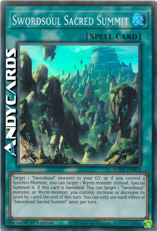 Target 1 "Swordsoul" monster in your GY, or if you control a Synchro Monster, you can target 1 Wyrm monster instead; Special Summon it. If this card is banished: You can target 1 "Swordsoul" monster, or Wyrm monster, you control; increase or decrease its Level by 1 until the end of this turn. You can only use each effect of "Swordsoul Sacred Summit" once per turn.