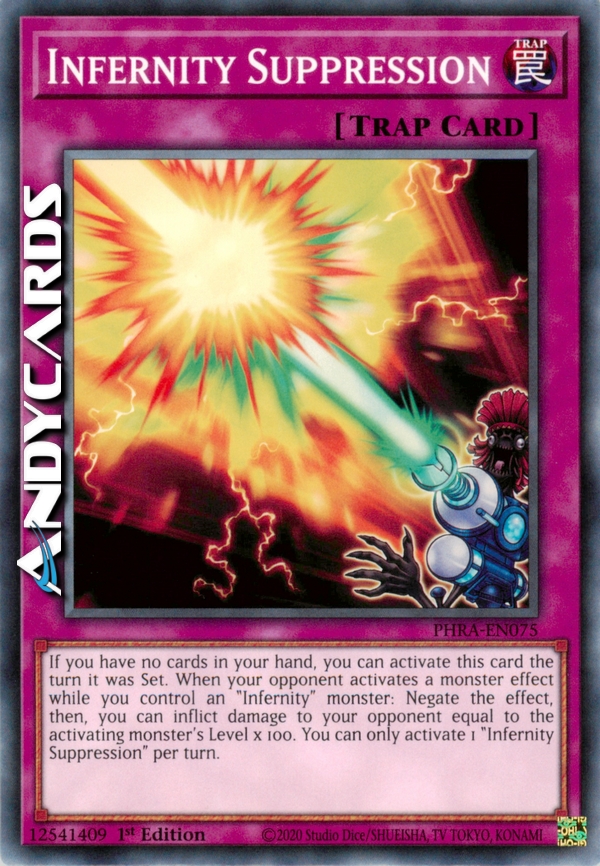 If you have no cards in your hand, you can activate this card the turn it was Set. When your opponent activates a monster effect while you control an "Infernity" monster: Negate the effect, then, you can inflict damage to your opponent equal to the activating monster's Level x 100. You can only activate 1 "Infernity Suppression" per turn.