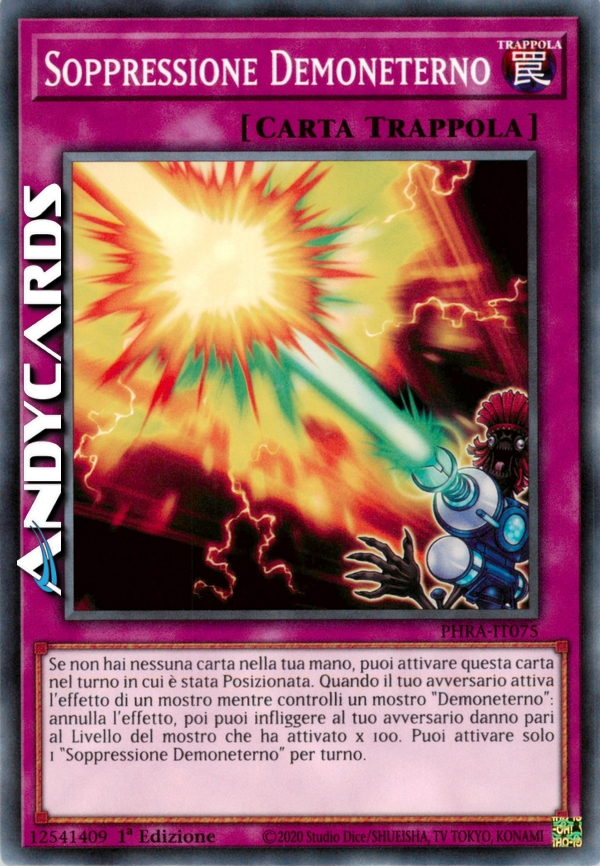 Se non hai nessuna carta nella tua mano, puoi attivare questa carta nel turno in cui è stata Posizionata. Quando il tuo avversario attiva l'effetto di un mostro mentre controlli un mostro "Demoneterno": annulla l'effetto, poi puoi infliggere al tuo avversario danno pari al Livello del mostro che ha attivato x 100. Puoi attivare solo 1 "Soppressione Demoneterno" per turno.