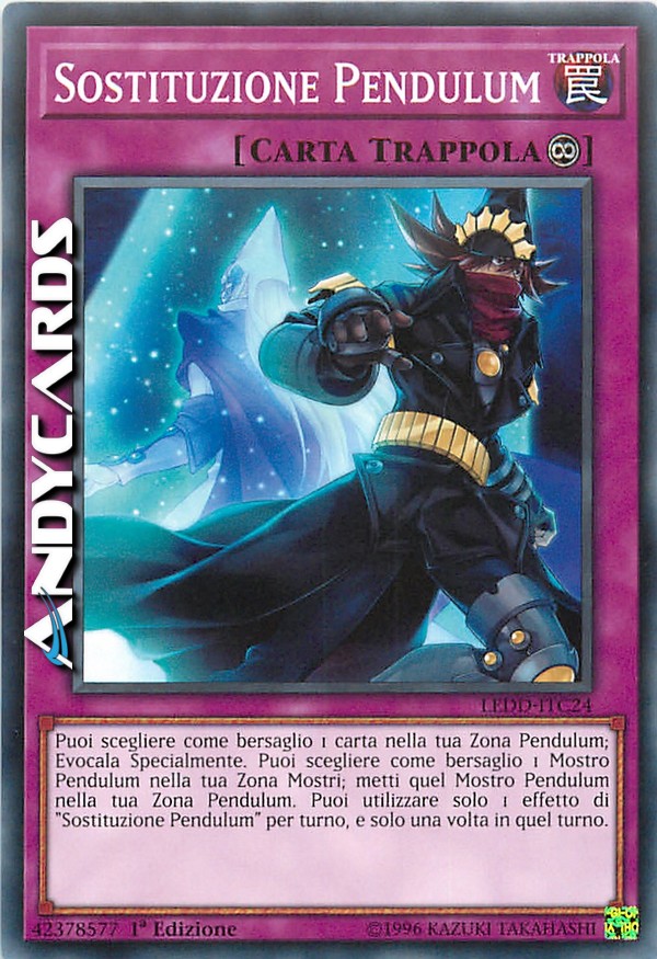 Puoi scegliere come bersaglio 1 carta nella tua Zona Pendulum; Evocala Specialmente. Puoi scegliere come bersaglio 1 Mostro Pendulum nella tua Zona Mostri; metti quel Mostro Pendulum nella tua Zona Pendulum. Puoi utilizzare solo 1 effetto di "Sostituzione Pendulum" per turno, e solo una volta in quel turno.