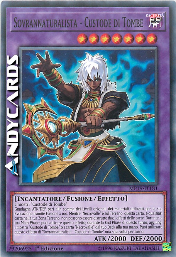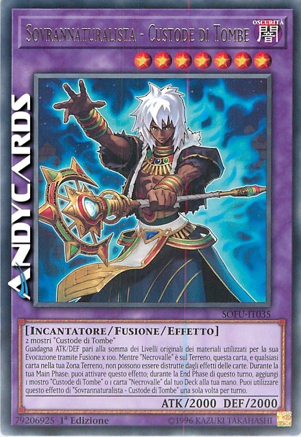 Guadagna ATK/DEF pari alla somma dei Livelli originali dei materiali utilizzati per la sua Evocazione tramite Fusione x 100. Mentre "Necrovalle" è sul Terreno, questa carta, e qualsiasi carta nella tua Zona Terreno, non possono essere distrutte dagli effetti delle carte. Durante la tua Main Phase: puoi attivare questo effetto; durante la End Phase di questo turno, aggiungi 1 mostro "Custode di Tombe" o 1 carta "Necrovalle" dal tuo Deck alla tua mano. Puoi utilizzare questo effetto di "Sovrannaturalista - Custode di Tombe" una sola volta per turno.