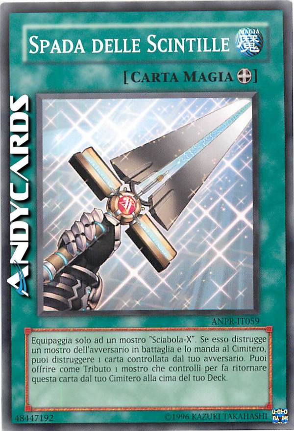Equipaggia solo ad un mostro "Sciabola-X". Se esso distrugge un mostro dell'avversario in battaglia e lo manda al Cimitero, puoi distruggere 1 carta controllata dal tuo avversario. Puoi offrire come Tributo 1 mostro che controlli per far ritornare questa carta dal tuo Cimitero alla cima del tuo Deck.