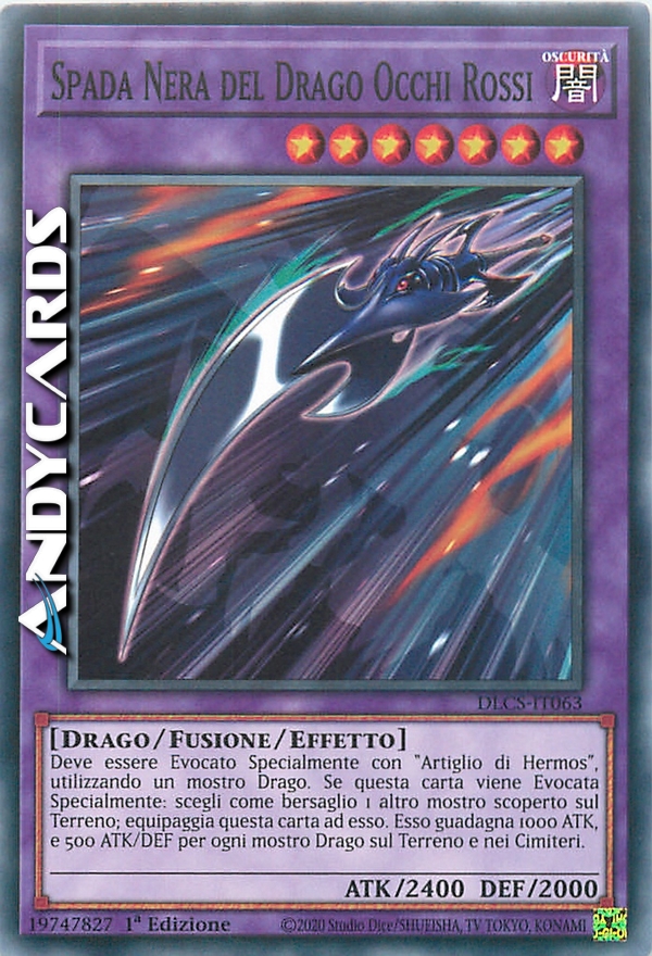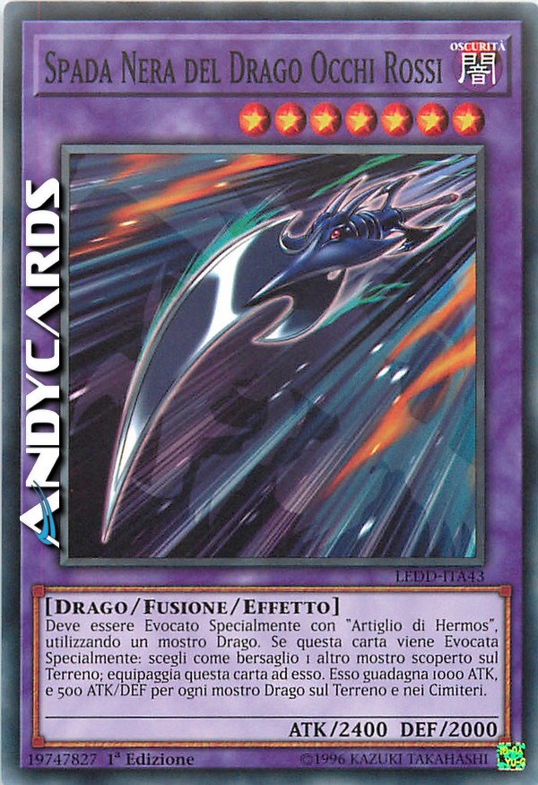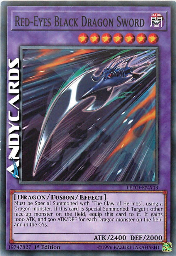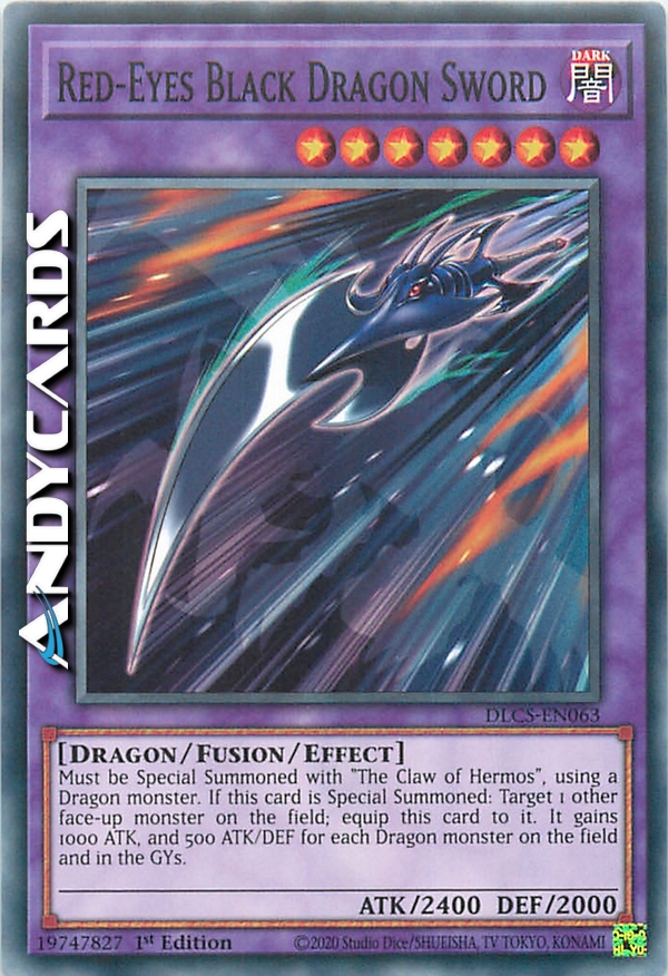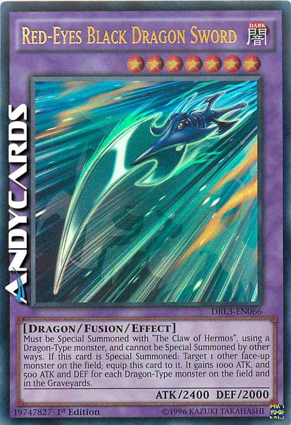 Deve essere Evocato Specialmente con "Artiglio di Hermos", utilizzando un mostro Drago. Se questa carta viene Evocata Specialmente: scegli come bersaglio 1 altro mostro scoperto sul Terreno; equipaggia questa carta ad esso. Esso guadagna 1000 ATK, e 500 ATK/DEF per ogni mostro Drago sul Terreno e nei Cimiteri.
