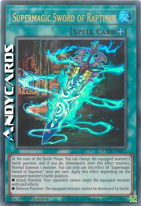 At the start of the Battle Phase: You can change the equipped monster's battle position, and if you do, immediately after this effect resolves, Normal Summon 1 monster. You can only use this effect of "Supermagic Sword of Raptinus" once per turn. Apply this effect depending on the equipped monster's battle position.