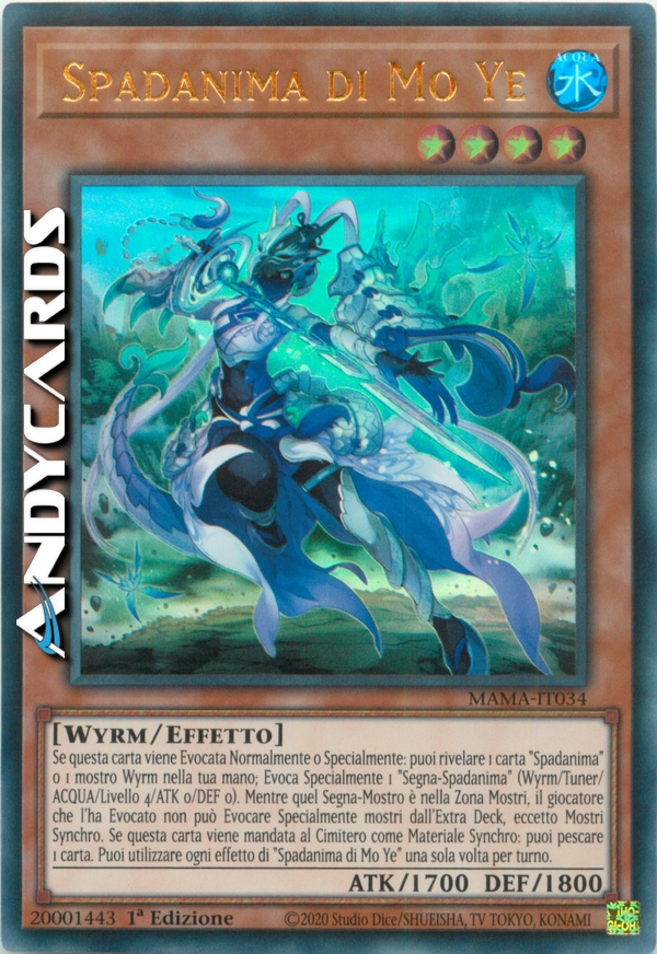 Se questa carta viene Evocata Normalmente o Specialmente: puoi rivelare 1 carta "Spadanima" o 1 mostro Wyrm nella tua mano; Evoca Specialmente 1 "Segna-Spadanima" (Wyrm/Tuner/ACQUA/Livello 4/ATK 0/DEF 0). Mentre quel Segna-Mostro è nella Zona Mostri, il giocatore che l'ha Evocato non può Evocare Specialmente mostri dall'Extra Deck, eccetto Mostri Synchro. Se questa carta viene mandata al Cimitero come Materiale Synchro: puoi pescare 1 carta. Puoi utilizzare ogni effetto di "Spadanima di Mo Ye" una sola volta per turno.