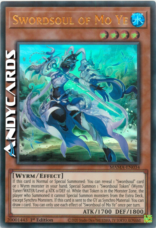 If this card is Normal or Special Summoned: You can reveal 1 "Swordsoul" card or 1 Wyrm monster in your hand; Special Summon 1 "Swordsoul Token" (Wyrm/Tuner/WATER/Level 4/ATK 0/DEF 0). While that Token is in the Monster Zone, the player who Summoned it cannot Special Summon monsters from the Extra Deck, except Synchro Monsters. If this card is sent to the GY as Synchro Material: You can draw 1 card. You can only use each effect of "Swordsoul of Mo Ye" once per turn.