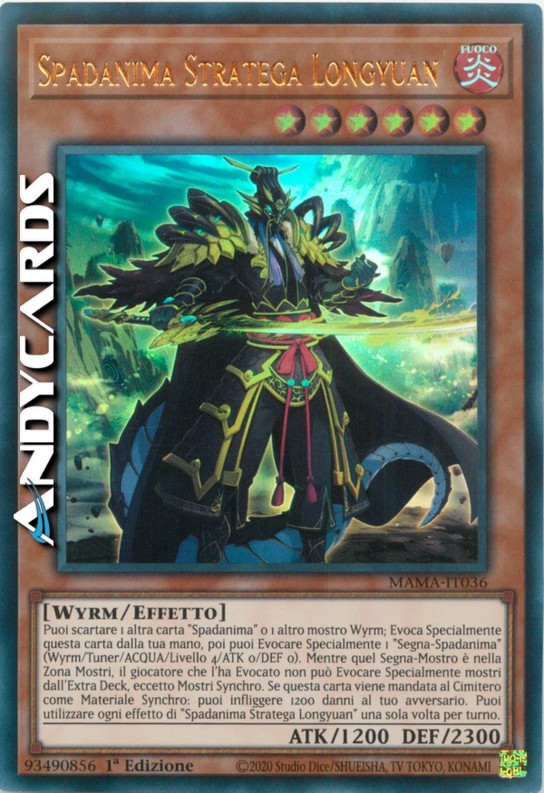 Puoi scartare 1 altra carta "Spadanima" o 1 altro mostro Wyrm; Evoca Specialmente questa carta dalla tua mano, poi puoi Evocare Specialmente 1 "Segna-Spadanima" (Wyrm/Tuner/ACQUA/Livello 4/ATK 0/DEF 0). Mentre quel Segna-Mostro è nella Zona Mostri, il giocatore che l'ha Evocato non può Evocare Specialmente mostri dall'Extra Deck, eccetto Mostri Synchro. Se questa carta viene mandata al Cimitero come Materiale Synchro: puoi infliggere 1200 danni al tuo avversario. Puoi utilizzare ogni effetto di "Spadanima Stratega Longyuan" una sola volta per turno.