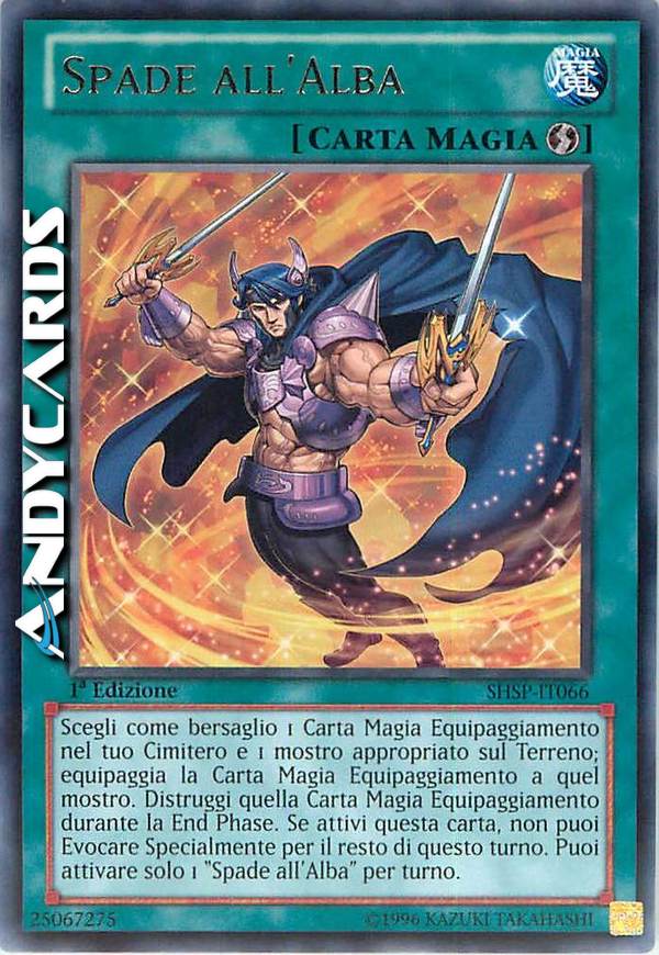 Scegli come bersaglio 1 Carta Magia Equipaggiamento nel tuo Cimitero e 1 mostro appropriato sul Terreno; equipaggia la Carta Magia Equipaggiamento a quel mostro. Distruggi quella Carta Magia Equipaggiamento durante la End Phase. Se attivi questa carta, non puoi Evocare Specialmente per il resto di questo turno. Puoi attivare solo 1 "Spade all'Alba" per turno.