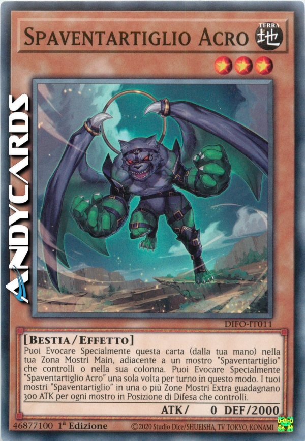 Puoi Evocare Specialmente questa carta (dalla tua mano) nella tua Zona Mostri Main, adiacente a un mostro "Spaventartiglio" che controlli o nella sua colonna. Puoi Evocare Specialmente "Spaventartiglio Acro" una sola volta per turno in questo modo. I tuoi mostri "Spaventartiglio" in una o più Zone Mostri Extra guadagnano 300 ATK per ogni mostro in Posizione di Difesa che controlli.