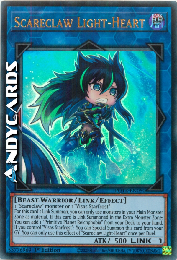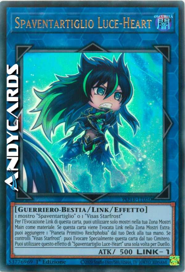 Per l'Evocazione Link di questa carta, puoi utilizzare solo mostri nella tua Zona Mostri Main come materiale. Se questa carta viene Evocata Link nella Zona Mostri Extra: puoi aggiungere 1 "Pianeta Primitivo Reichphobia" dal tuo Deck alla tua mano. Se controlli "Visas Starfrost": puoi Evocare Specialmente questa carta dal tuo Cimitero. Puoi utilizzare questo effetto di "Spaventartiglio Luce-Heart" una sola volta per Duello.