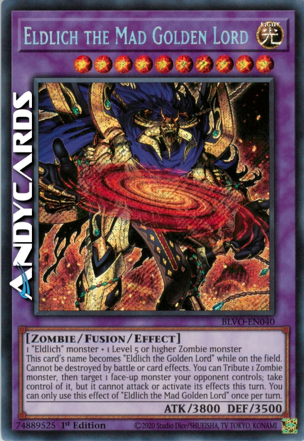This card's name becomes "Eldlich the Golden Lord" while on the field. Cannot be destroyed by battle or card effects. You can Tribute 1 Zombie monster, then target 1 face-up monster your opponent controls; take control of it, but it cannot attack or activate its effects this turn. You can only use this effect of "Eldlich the Mad Golden Lord" once per turn.