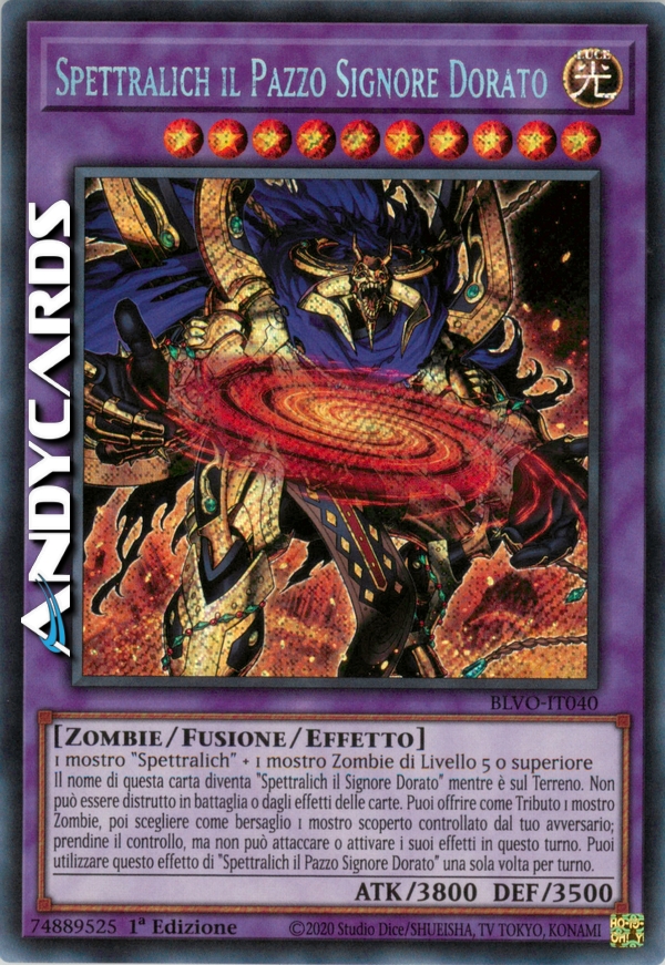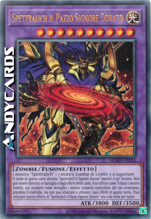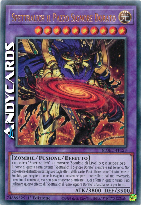 Il nome di questa carta diventa "Spettralich il Signore Dorato" mentre è sul Terreno. Non può essere distrutto in battaglia o dagli effetti delle carte. Puoi offrire come Tributo 1 mostro Zombie, poi scegliere come bersaglio 1 mostro scoperto controllato dal tuo avversario; prendine il controllo, ma non può attaccare o attivare i suoi effetti in questo turno. Puoi utilizzare questo effetto di "Spettralich il Pazzo Signore Dorato" una sola volta per turno.