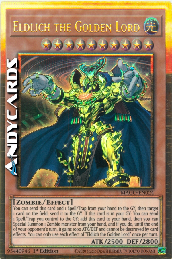 You can send this card and 1 Spell/Trap from your hand to the GY, then target 1 card on the field; send it to the GY. If this card is in your GY: You can send 1 Spell/Trap you control to the GY; add this card to your hand, then you can Special Summon 1 Zombie monster from your hand, and if you do, until the end of your opponent's turn, it gains 1000 ATK/DEF and cannot be destroyed by card effects. You can only use each effect of "Eldlich the Golden Lord" once per turn.