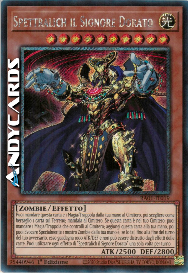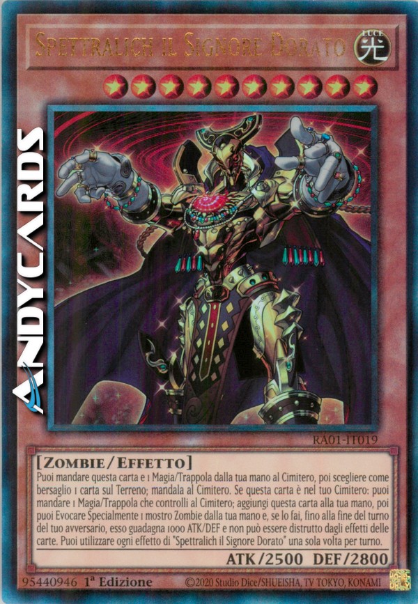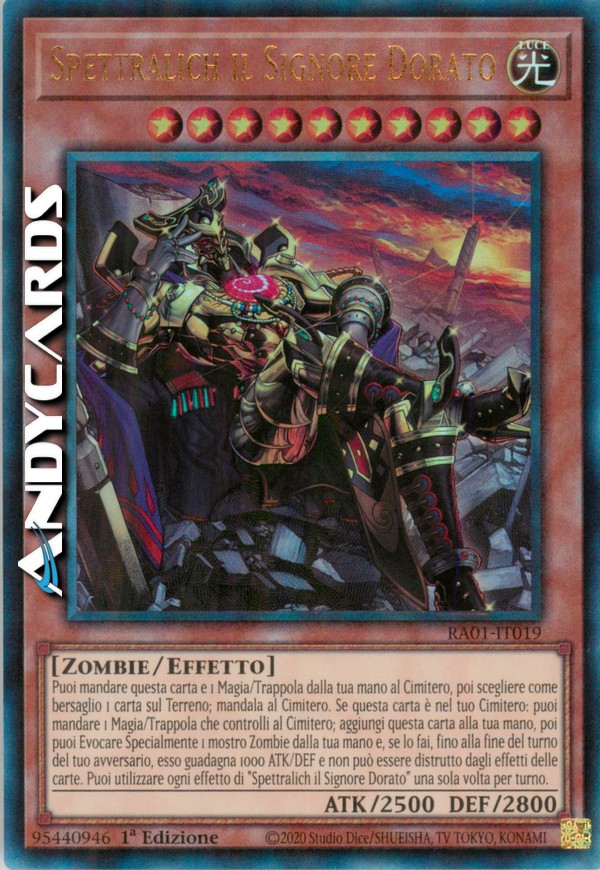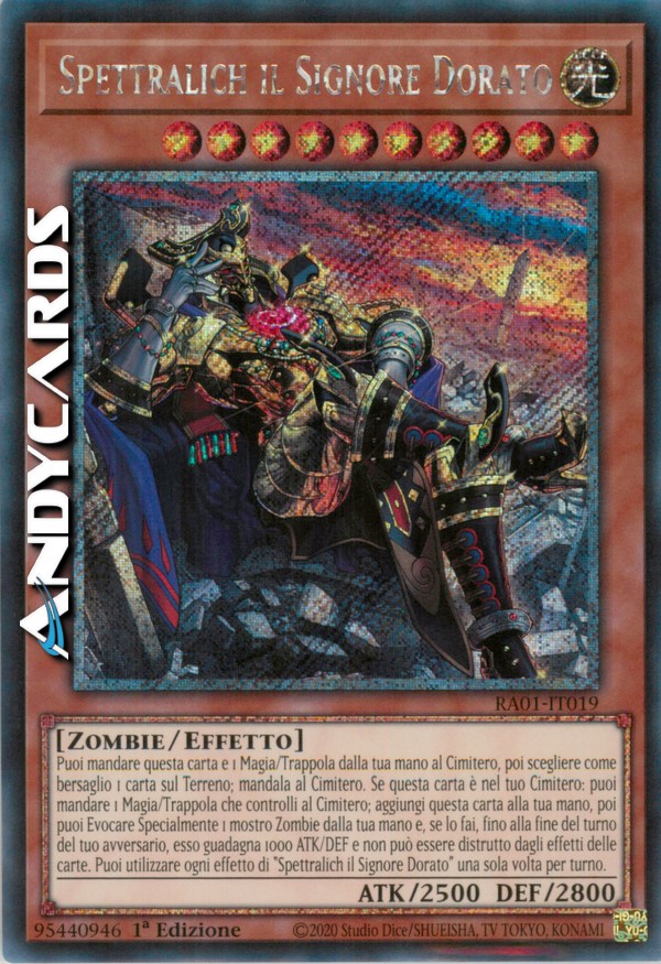 Puoi mandare questa carta e 1 Magia/Trappola dalla tua mano al Cimitero, poi scegliere come bersaglio 1 carta sul Terreno; mandala al Cimitero. Se questa carta è nel tuo Cimitero: puoi mandare 1 Magia/Trappola che controlli al Cimitero; aggiungi questa carta alla tua mano, poi puoi Evocare Specialmente 1 mostro Zombie dalla tua mano e, se lo fai, fino alla fine del turno del tuo avversario, esso guadagna 1000 ATK/DEF e non può essere distrutto dagli effetti delle carte. Puoi utilizzare ogni effetto di "Spettralich il Signore Dorato" una sola volta per turno.