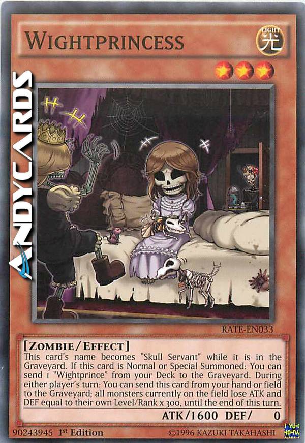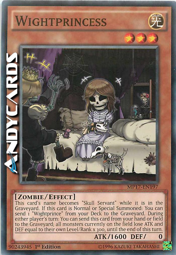 This card's name becomes "Skull Servant" while in the GY. If this card is Normal or Special Summoned: You can send 1 "Wightprince" from your Deck to the GY. (Quick Effect): You can send this card from your hand or field to the GY; all monsters currently on the field lose ATK/DEF equal to their own Level/Rank x 300, until the end of this turn.