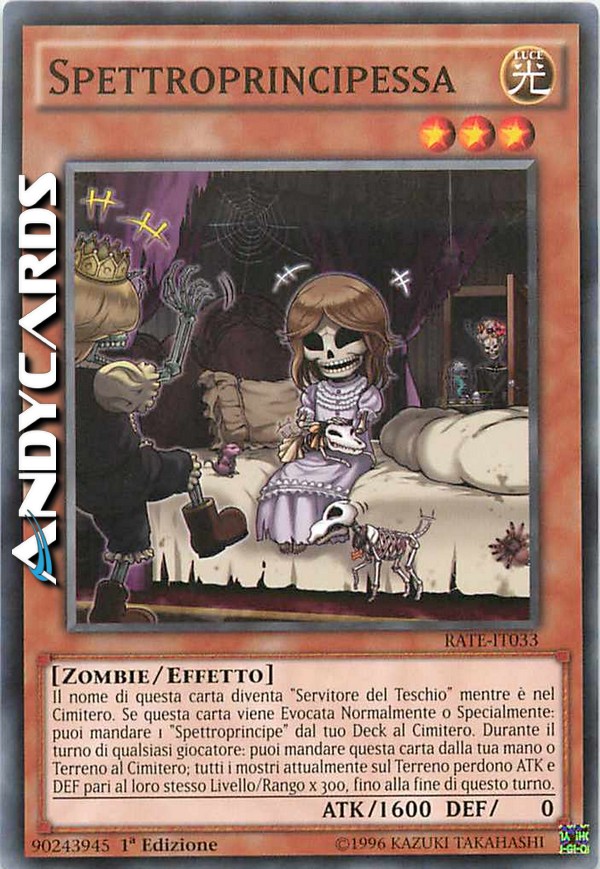 Il nome di questa carta diventa "Servitore del Teschio" mentre è nel Cimitero. Se questa carta viene Evocata Normalmente o Specialmente: puoi mandare 1 "Spettroprincipe" dal tuo Deck al Cimitero. (Effetto Rapido): puoi mandare questa carta dalla tua mano o Terreno al Cimitero; tutti i mostri attualmente sul Terreno perdono ATK/DEF pari al loro stesso Livello/Rango x 300, fino alla fine di questo turno.